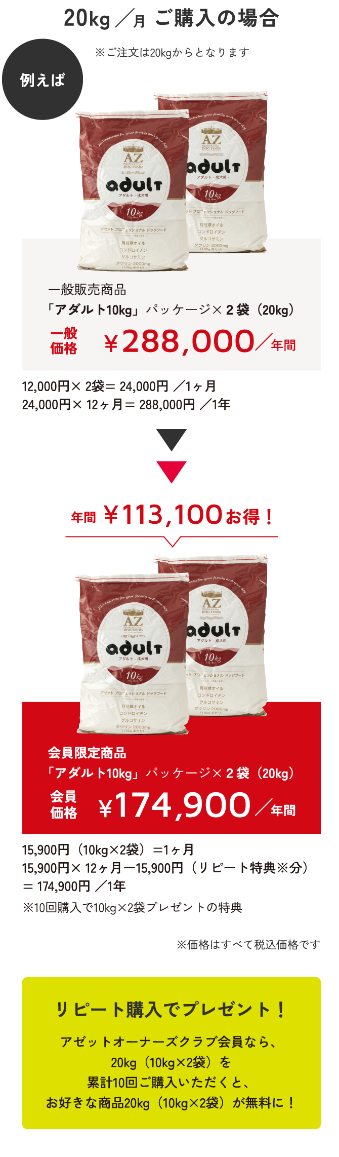 アゼットオーナーズクラブは、フード消費が多い一般オーナー様が、弊社のプロフェッショナルフードを一般価格よりもお求め安い価格で購入いただけるスペシャルプログラムです。嬉しいリピーター特典付きで、大型犬や多頭飼いなどフードコストを抑えたいオーナー様にオススメです!