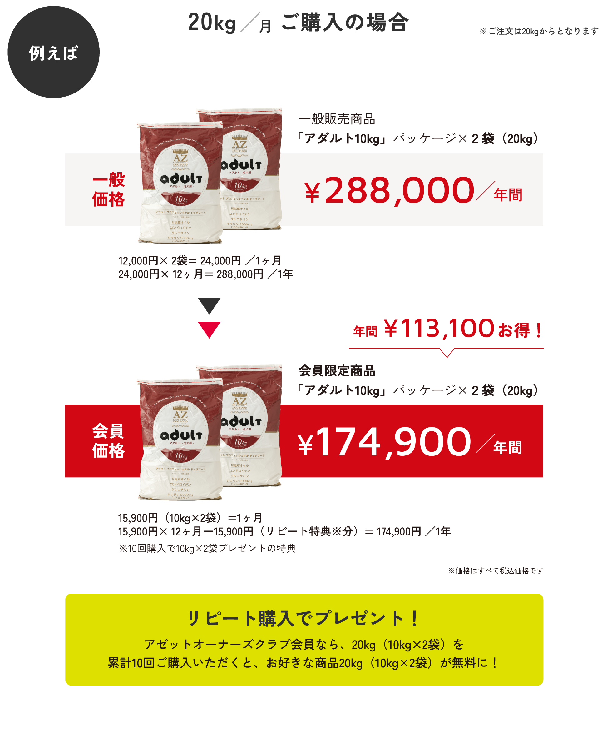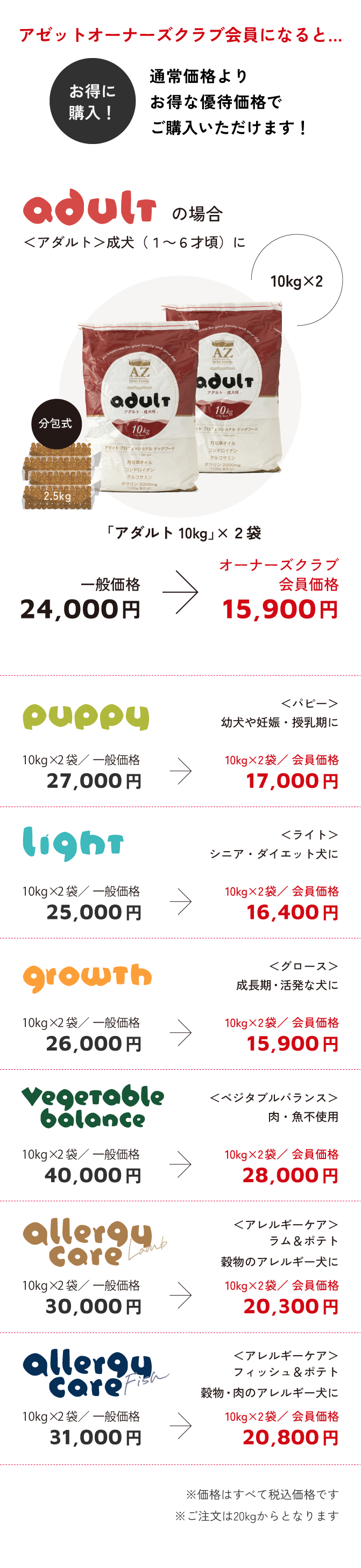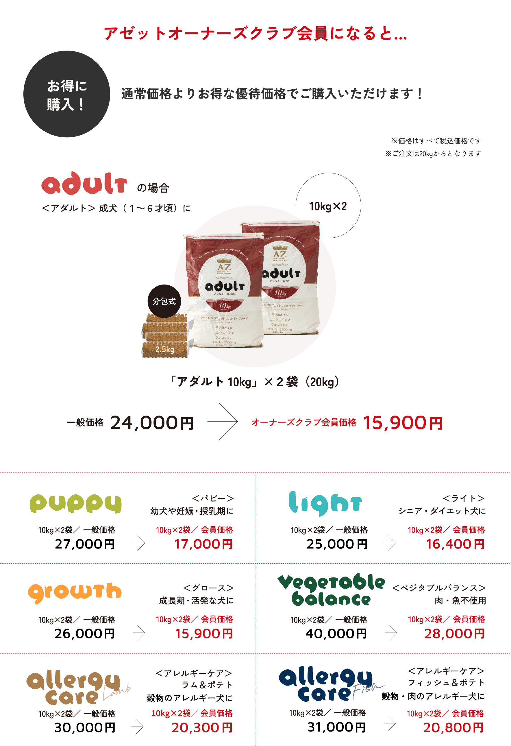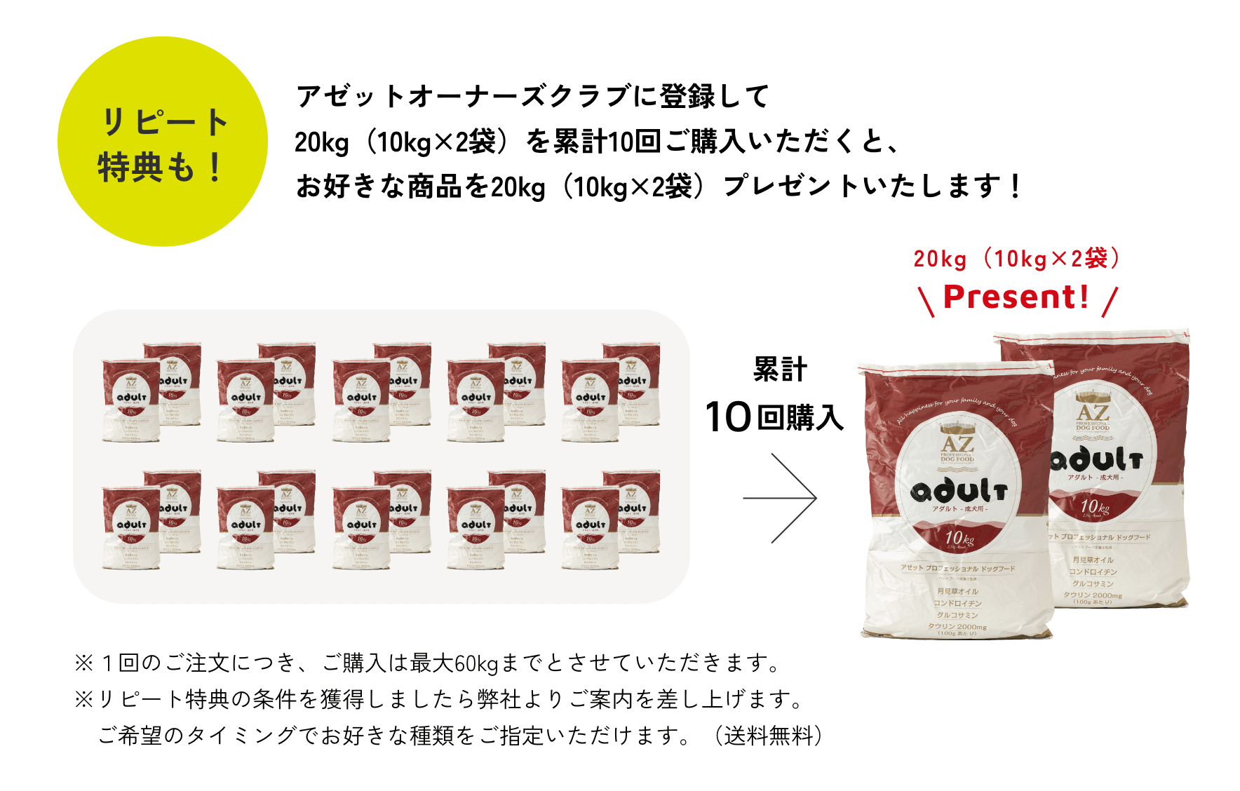 アゼットオーナーズクラブは、フード消費が多い一般オーナー様が、弊社のプロフェッショナルフードを一般価格よりもお求め安い価格で購入いただけるスペシャルプログラムです。嬉しいリピーター特典付きで、大型犬や多頭飼いなどフードコストを抑えたいオーナー様にオススメです!